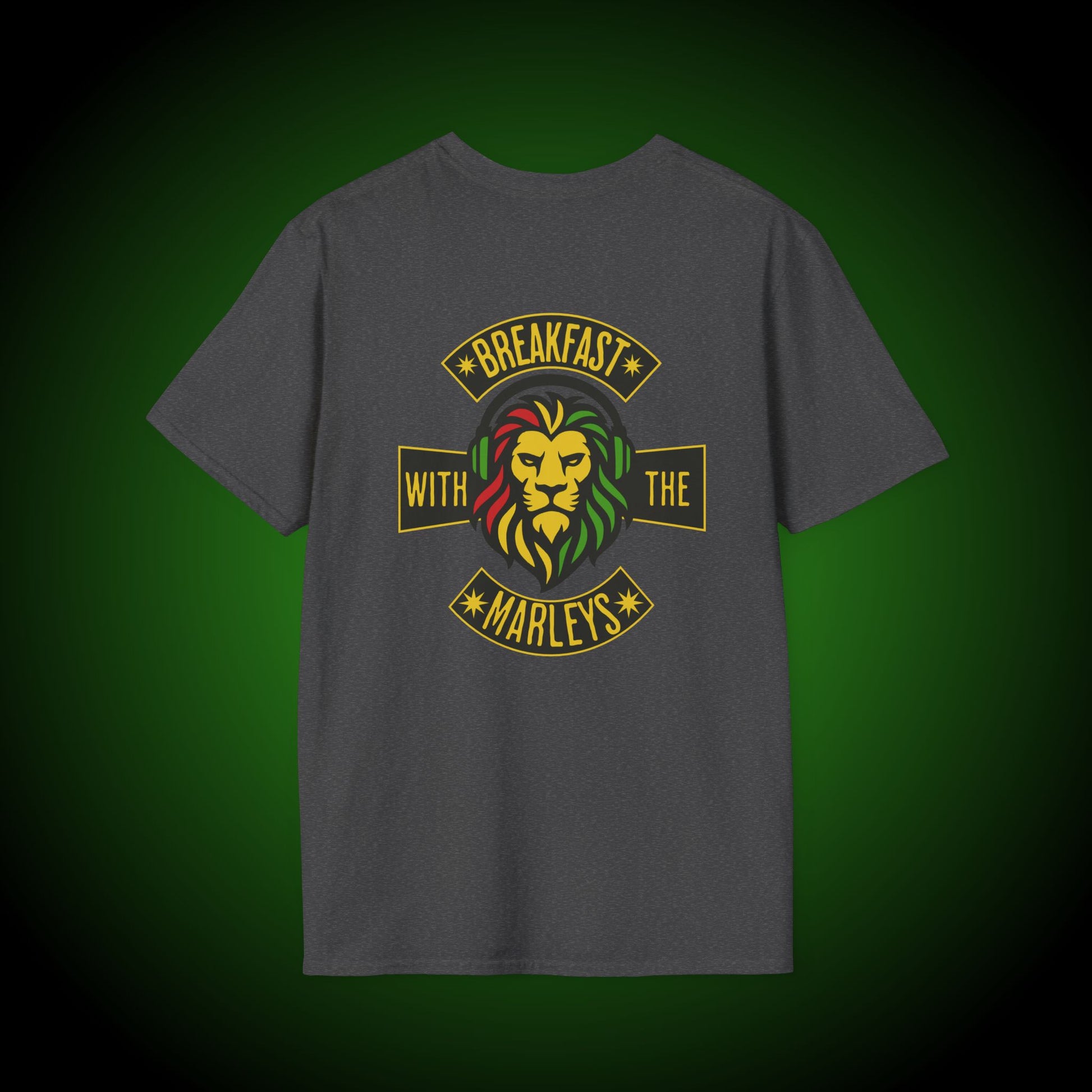 The perfect gear for the dedicated listener. This is the official Unisex Softstyle T-Shirt for "Breakfast With The Marleys," your weekly journey into the musical legacy of the Marley family, heard every Saturday at 8am HST on the Hawaii Reggae Network.