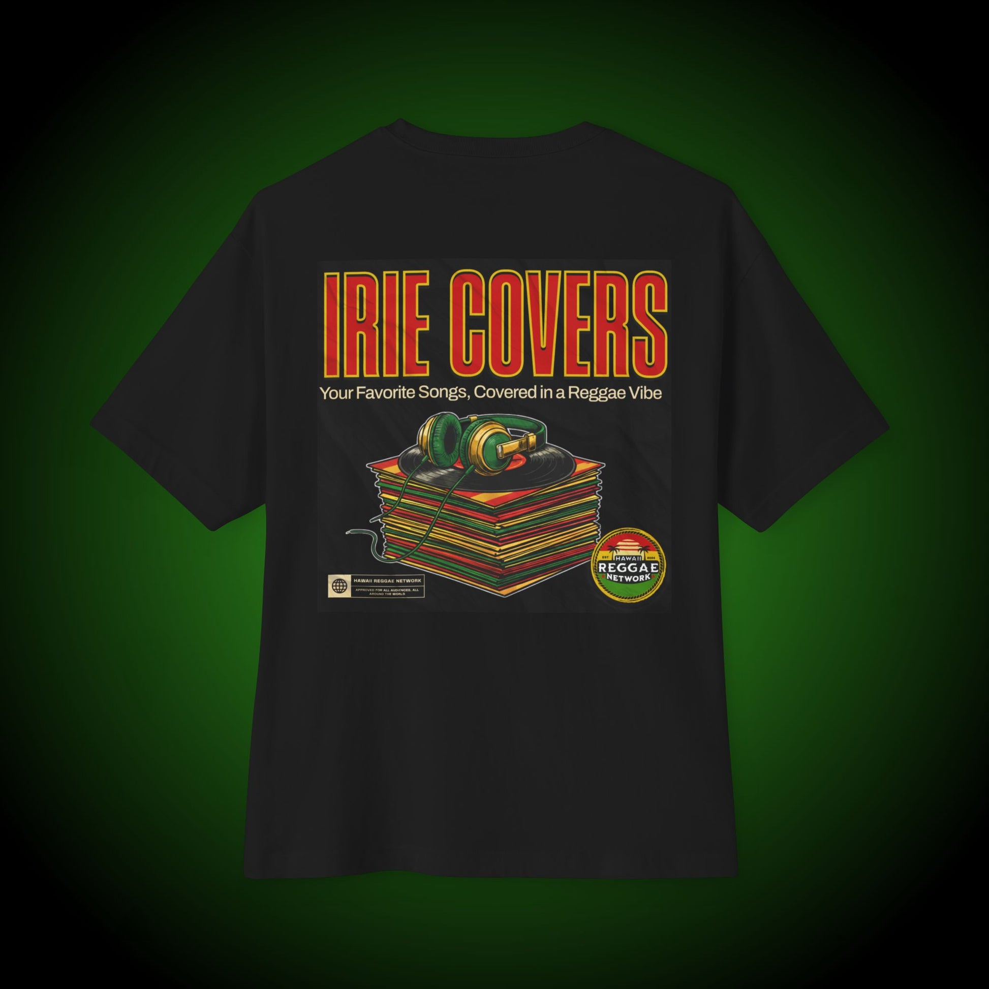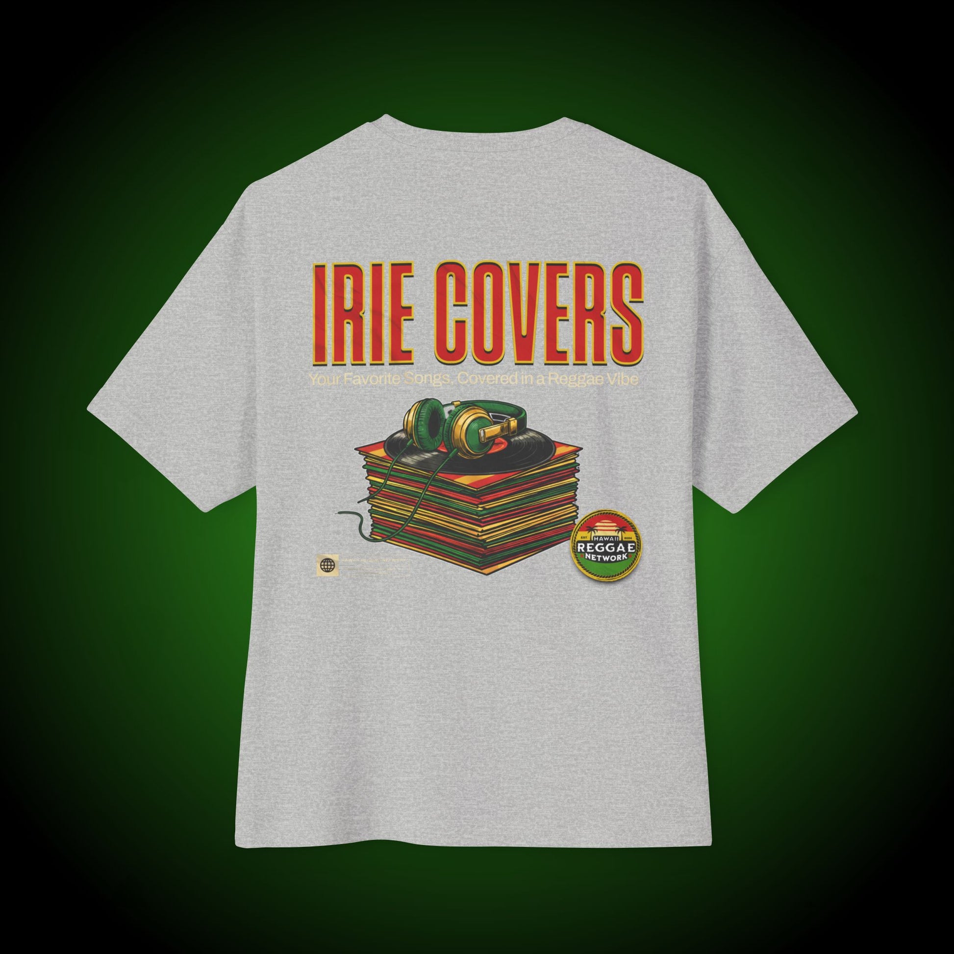 This shirt features the classic "Irie Covers" logo, complete with a massive stack of red, gold, and green-sleeved vinyl and a pair of headphones, ready to spin the next reimagined classic. It’s the perfect tee for every music lover who appreciates the art of the cover.