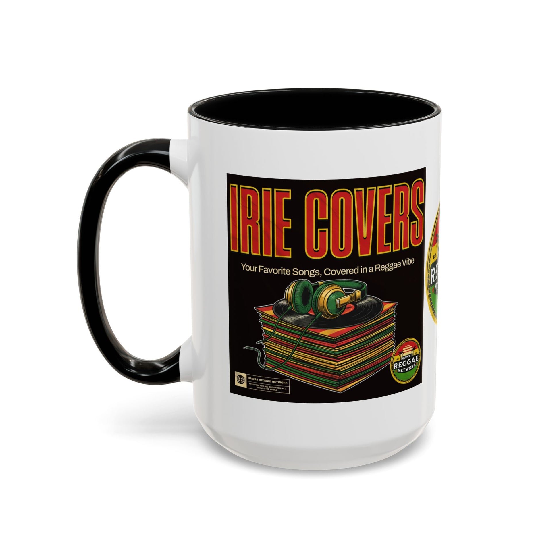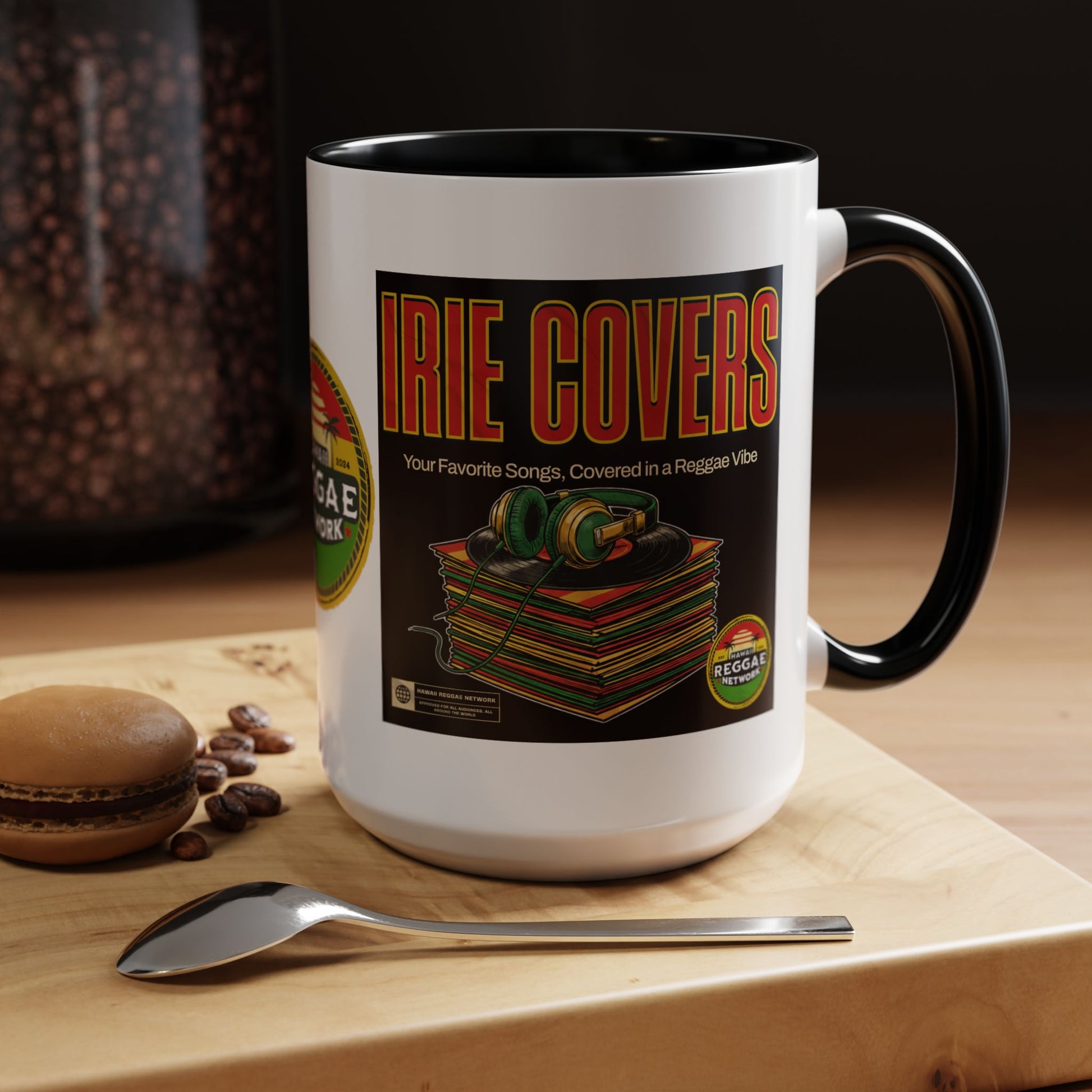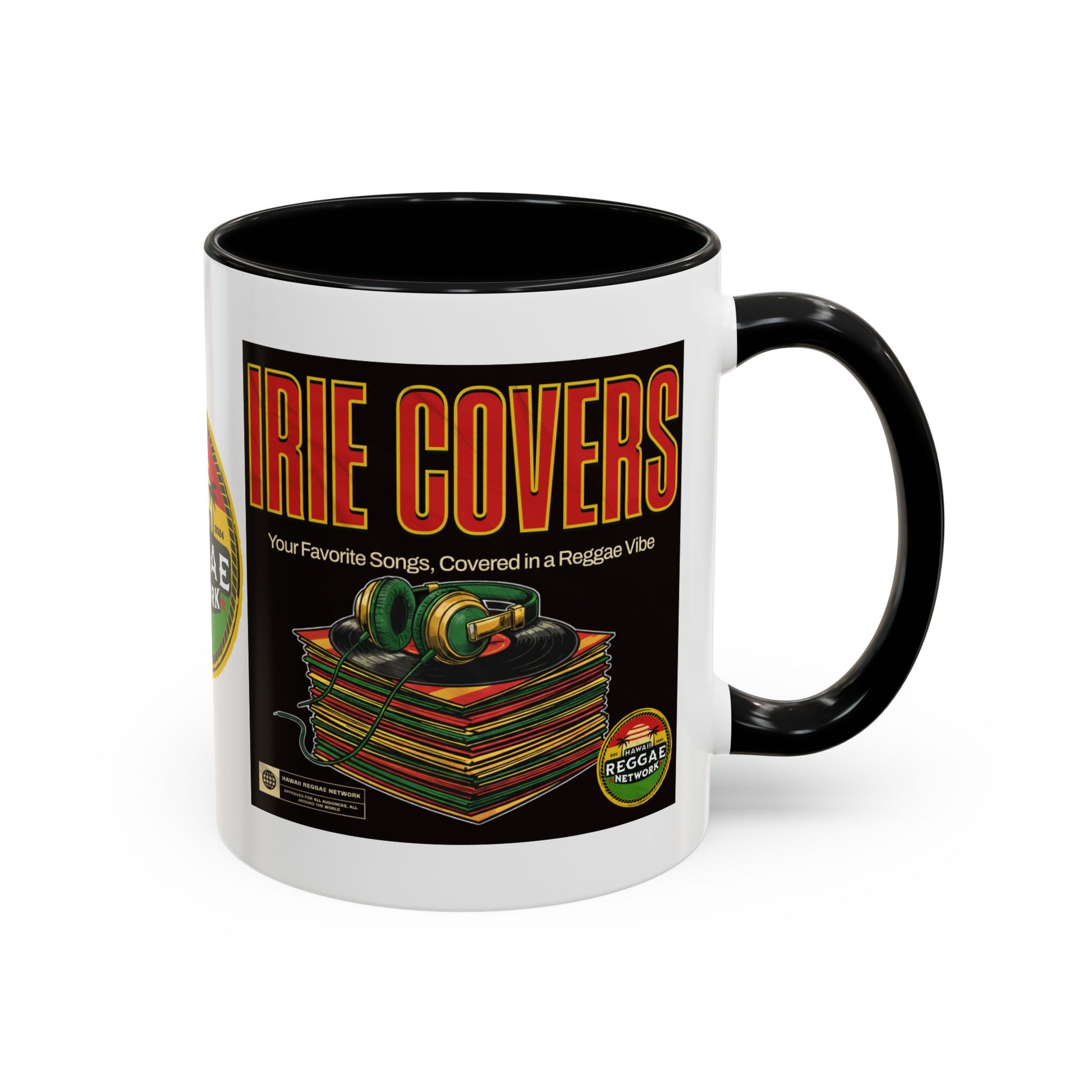 This high-quality ceramic mug features the classic "Irie Covers" logo, with its bold title and a heavy stack of red, gold, and green-sleeved vinyl, just waiting to be played. It’s the perfect visual for a show that digs deep to find the best reggae versions of your favorite songs.